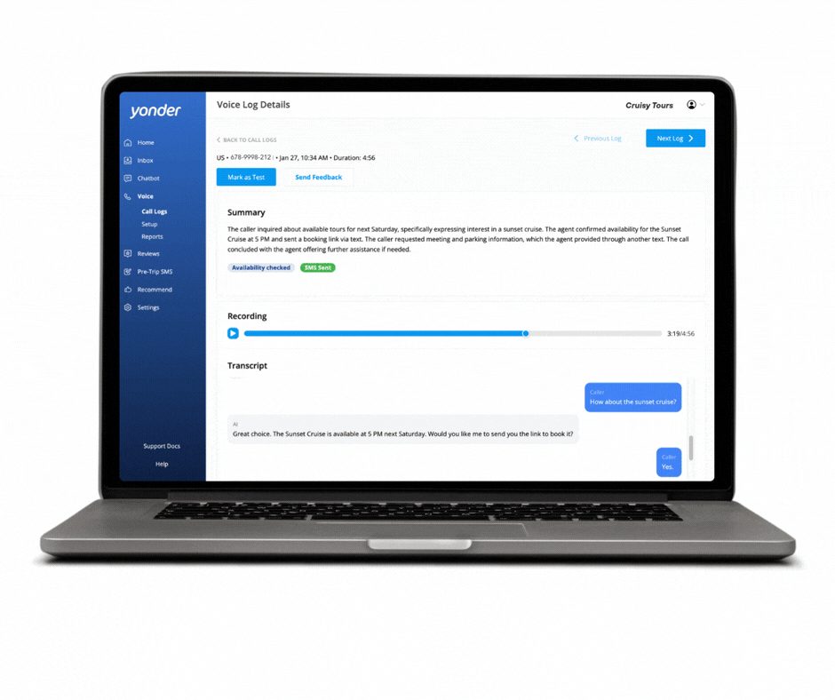 Yonder's AI Voice Agent integrates directly with your booking platform — checking real-time availability and giving callers accurate answers about specific dates, group sizes, and tour options without your team needing to be involved. When a caller is ready to book, the agent sends a direct booking link to their phone via SMS — no dropped threads, no sticky notes, no lost leads.