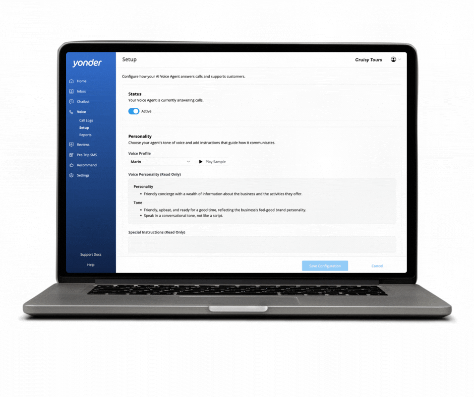 Yonder's AI Voice Agent answers every incoming call instantly — no hold music, no voicemail, no missed opportunities. It understands what callers are asking, responds in a natural conversational voice, and handles the kinds of questions that drive the majority of inbound tourism calls: