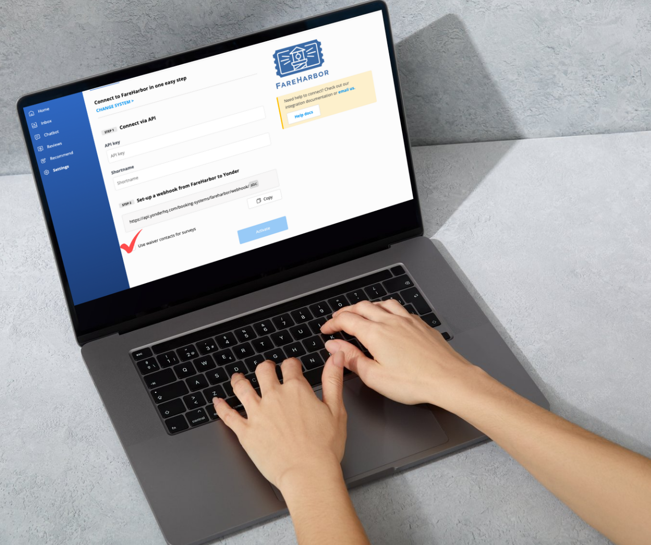 The integration requires minimal setup. In your Yonder dashboard, navigate to Settings → Integrations and toggle on "Use waivers for surveys." Your existing FareHarbor workflow remains completely unchanged — guests experience the same seamless waiver process they're used to, while you gain powerful new capabilities behind the scenes.