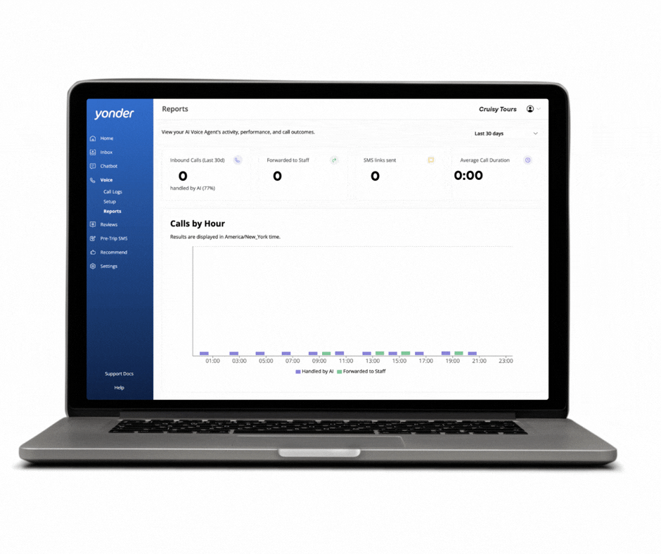 For the Voice Agent to check live availability and send dynamic booking links, your reservation system needs to be connected to Yonder. Supported integrations include FareHarbor, Ibis, Rezdy, Cobber, Customlinc, and more.