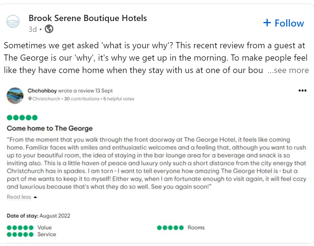 Pulling your best reviews into social media posts, email newsletters, and any printed materials is a straightforward way to let the voice of your customers do your marketing for you. A specific, enthusiastic review from a real guest is far more persuasive than any promotional copy you could write.