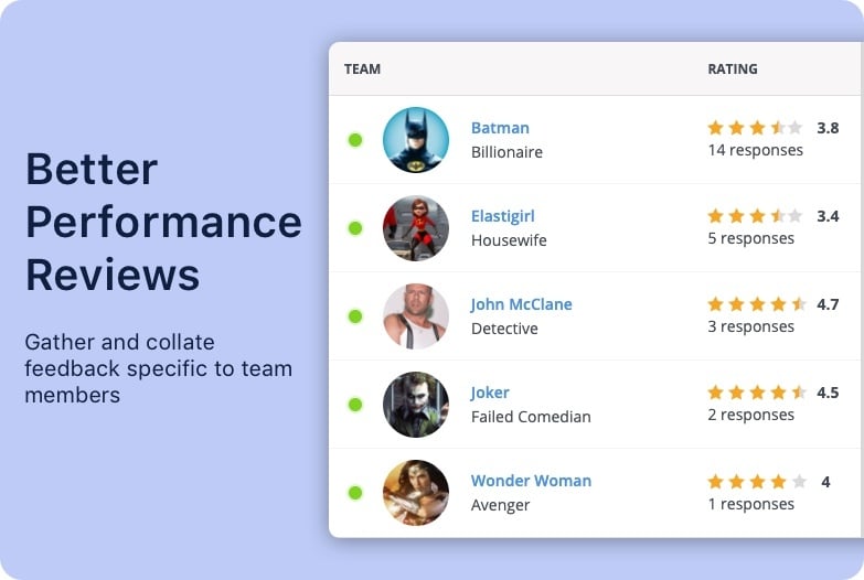 Drill down into individual results. Need to look more closely at a specific team member's feedback over a particular period? The dashboard lets you dig into the detail, giving you the context behind the numbers.