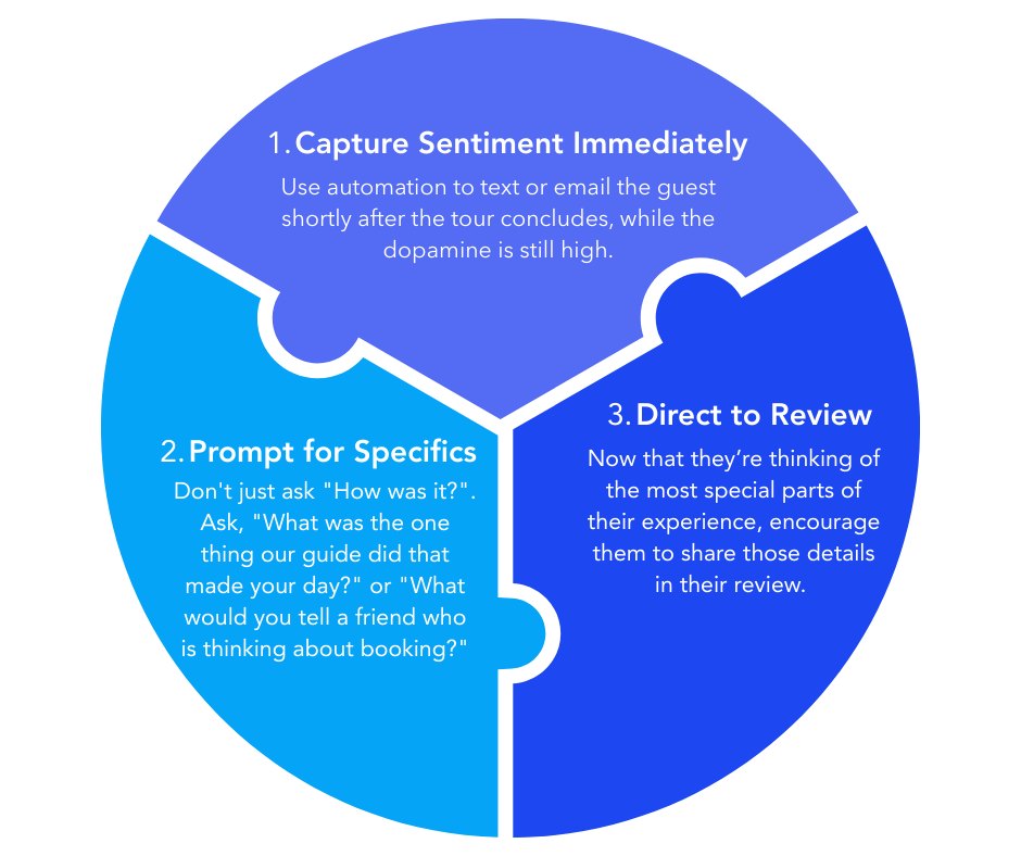 Prompt for specifics. Don't just ask "How was it?" Ask "What was the one thing our guide did that made your day?" or "What would you tell a friend who's thinking about booking?" These prompts surface the specifics that become compelling reviews — the kind that name a guide, describe a moment, and tell a story.